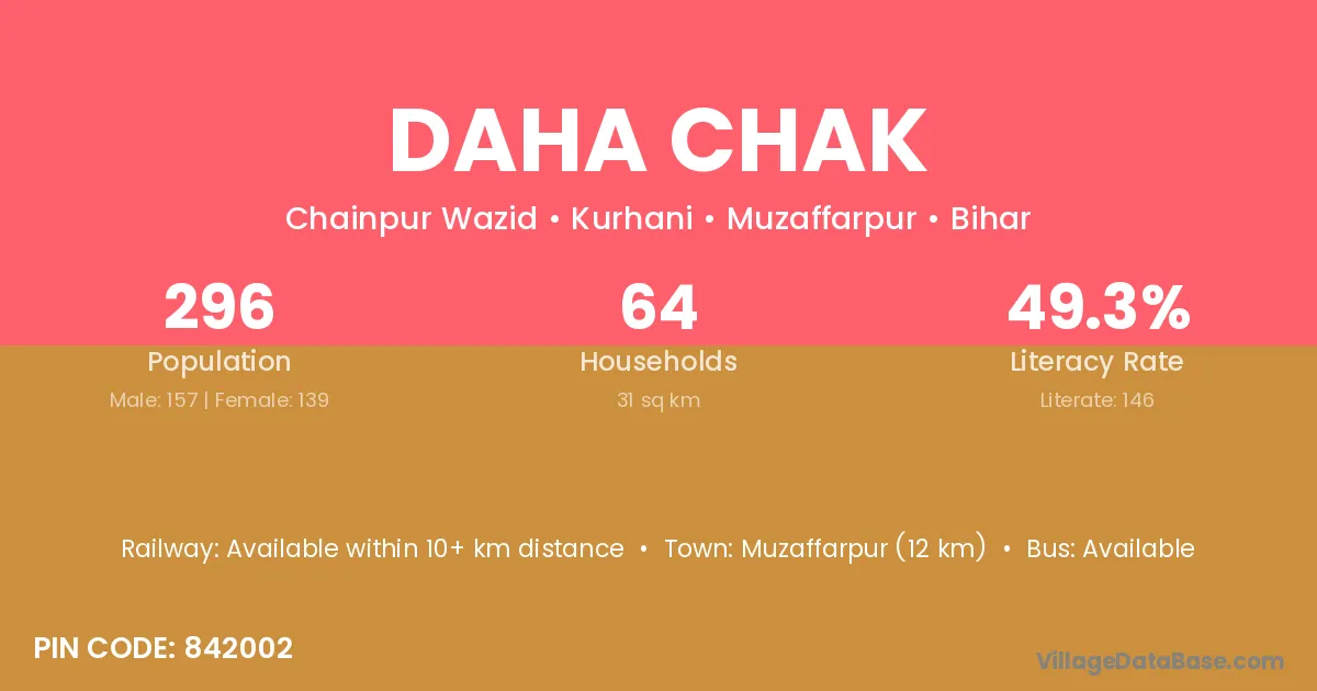 Muzaffarpur (12 km) is the nearest town to Daha Chak village for major economic activities and is located approximately 12 km away.