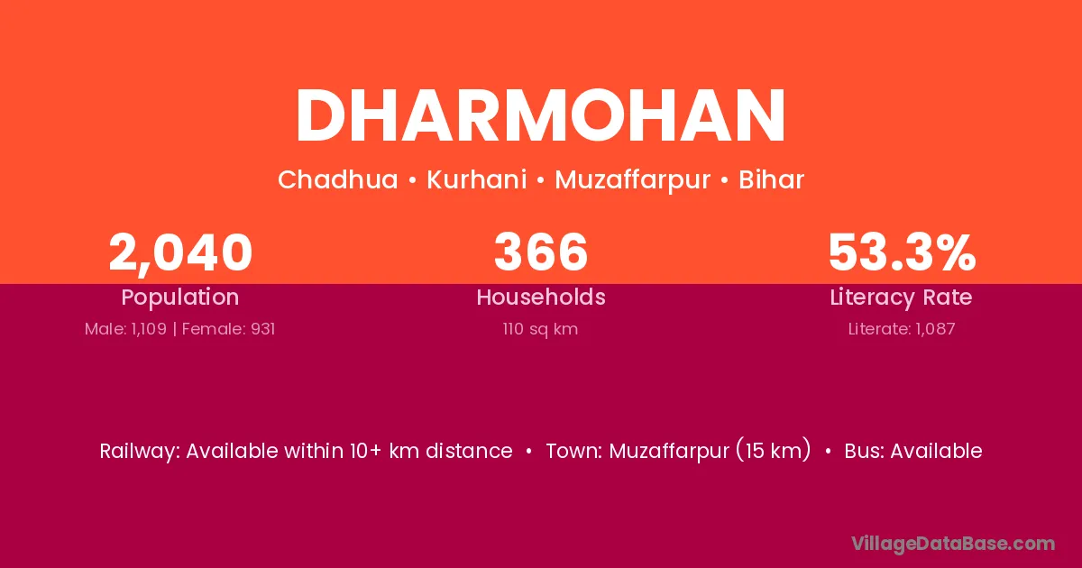 Muzaffarpur (15 km) is the nearest town to Dharmohan village for major economic activities and is located approximately 15 km away.