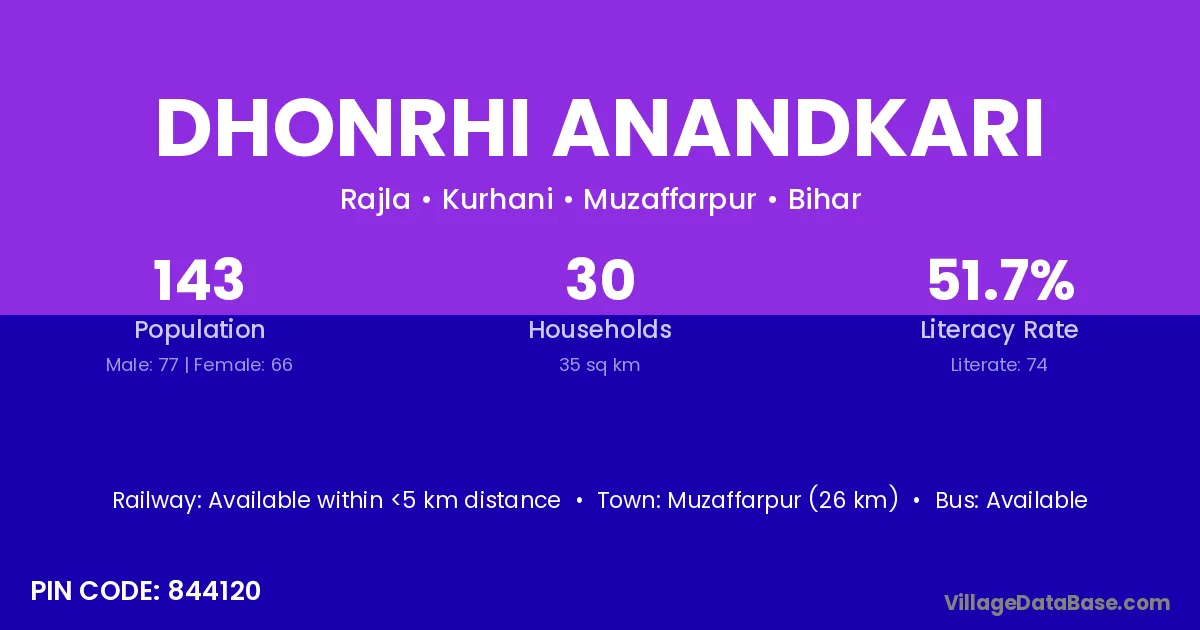 Muzaffarpur (26 km) is the nearest town to Dhonrhi Anandkari village for major economic activities and is located approximately 26 km away.