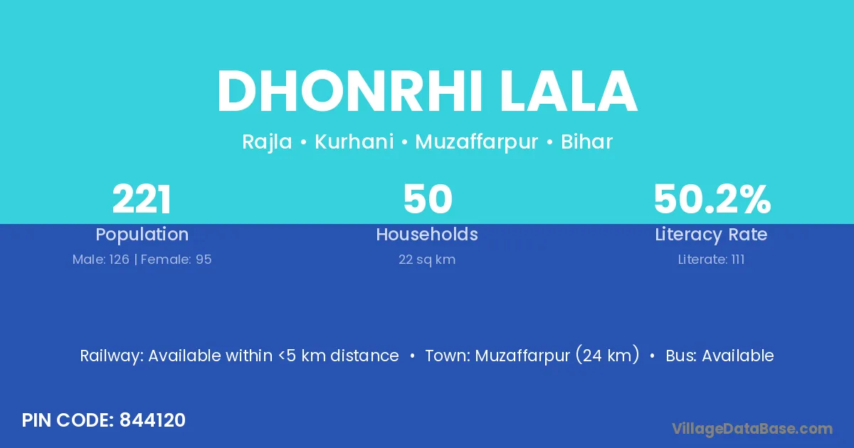 Muzaffarpur (24 km) is the nearest town to Dhonrhi Lala village for major economic activities and is located approximately 24 km away.