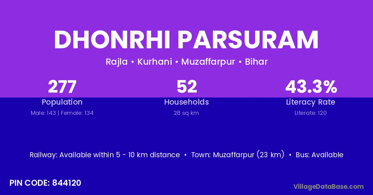 Muzaffarpur (23 km) is the nearest town to Dhonrhi Parsuram village for major economic activities and is located approximately 23 km away.