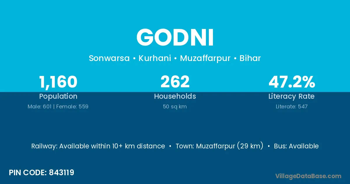 Muzaffarpur (29 km) is the nearest town to Godni village for major economic activities and is located approximately 29 km away.