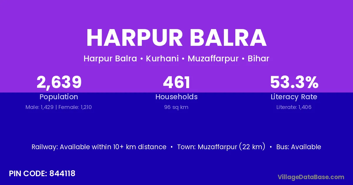 Muzaffarpur (22 km) is the nearest town to Harpur Balra village for major economic activities and is located approximately 22 km away.