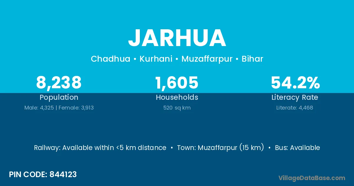 Muzaffarpur (15 km) is the nearest town to Jarhua village for major economic activities and is located approximately 15 km away.