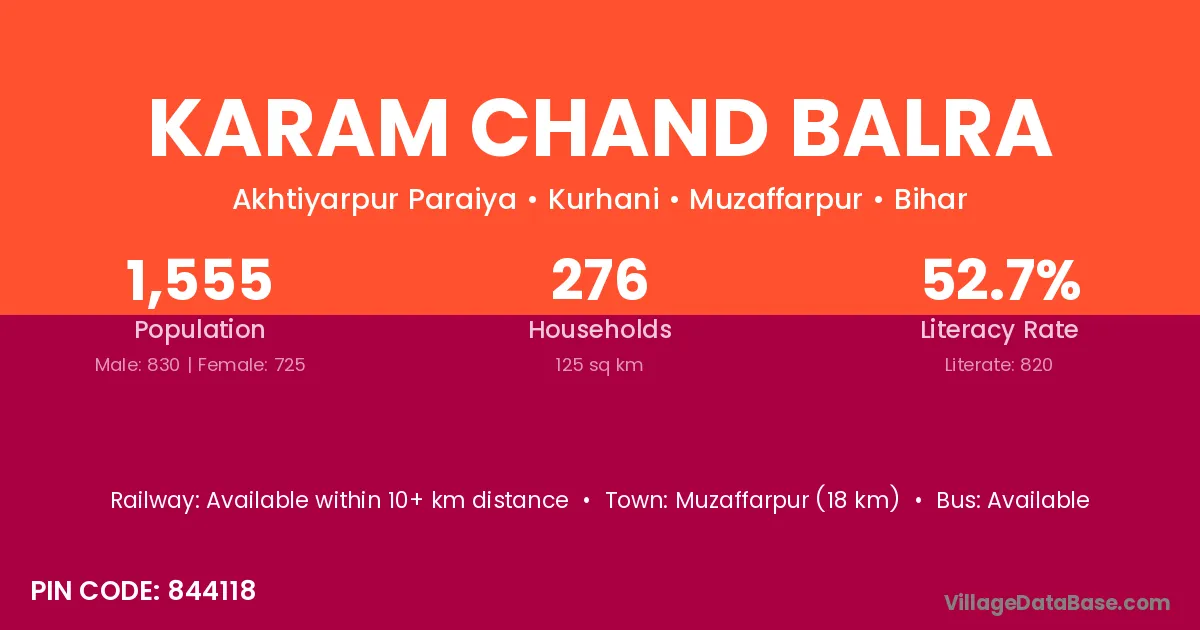 Muzaffarpur (18 km) is the nearest town to Karam Chand Balra village for major economic activities and is located approximately 18 km away.