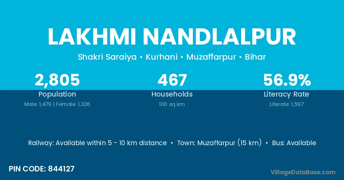 Muzaffarpur (15 km) is the nearest town to Lakhmi Nandlalpur village for major economic activities and is located approximately 15 km away.