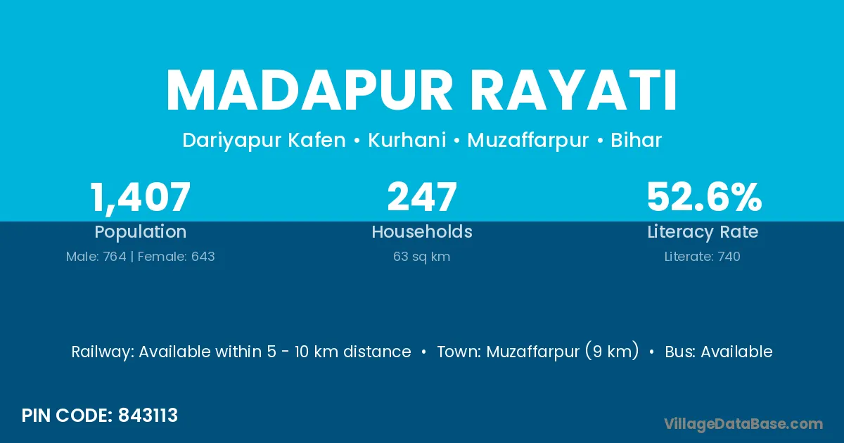 Muzaffarpur (9 km) is the nearest town to Madapur Rayati village for major economic activities and is located approximately 9 km away.