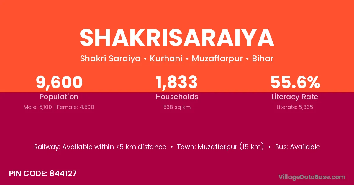 Muzaffarpur (15 km) is the nearest town to Shakrisaraiya village for major economic activities and is located approximately 15 km away.