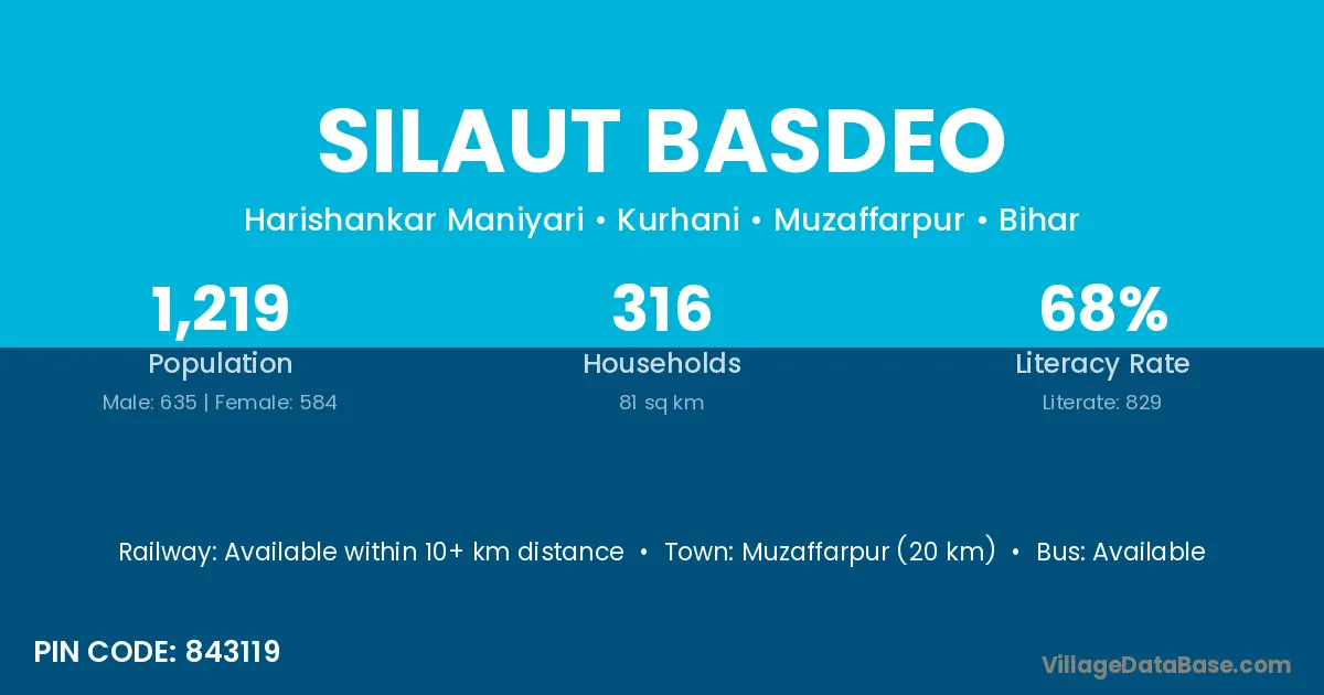 Muzaffarpur (20 km) is the nearest town to Silaut Basdeo village for major economic activities and is located approximately 20 km away.