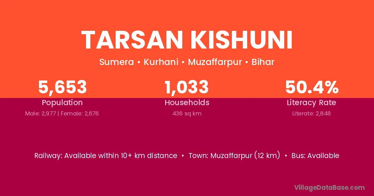 Muzaffarpur (12 km) is the nearest town to Tarsan Kishuni village for major economic activities and is located approximately 12 km away.