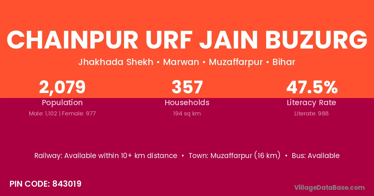 Muzaffarpur (16 km) is the nearest town to Chainpur Urf Jain Buzurg village for major economic activities and is located approximately 16 km away.