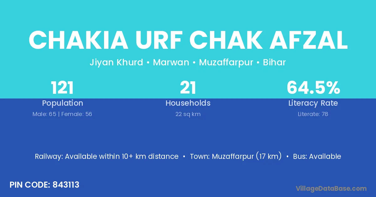 Chakia Urf Chak Afzal village has a total population of 121 people, of which 65 are males and 56 are females.