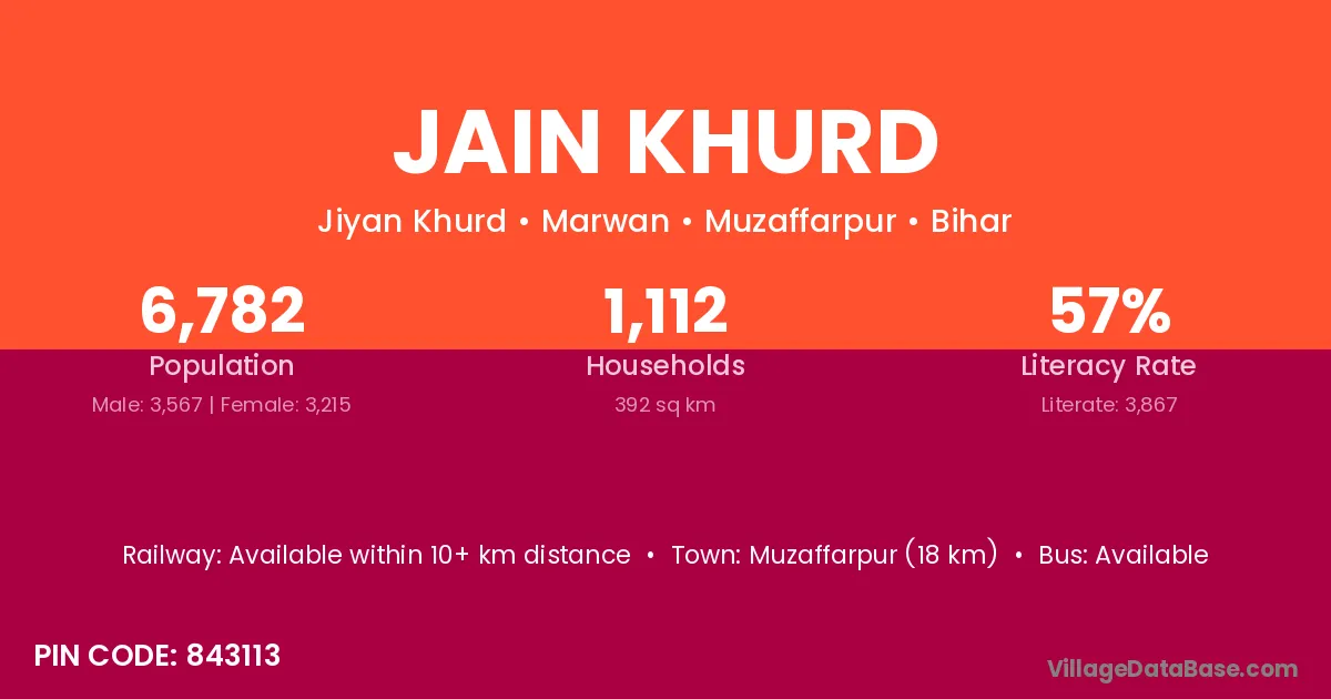 Muzaffarpur (18 km) is the nearest town to Jain Khurd village for major economic activities and is located approximately 18 km away.