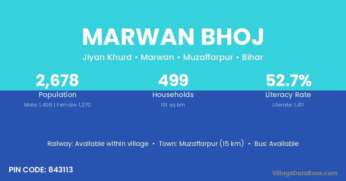 Muzaffarpur (15 km) is the nearest town to Marwan Bhoj village for major economic activities and is located approximately 15 km away.