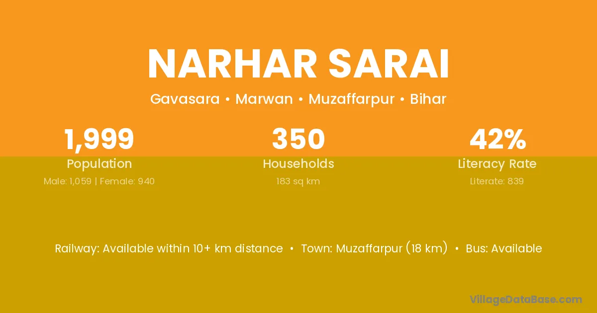 Muzaffarpur (18 km) is the nearest town to Narhar Sarai village for major economic activities and is located approximately 18 km away.
