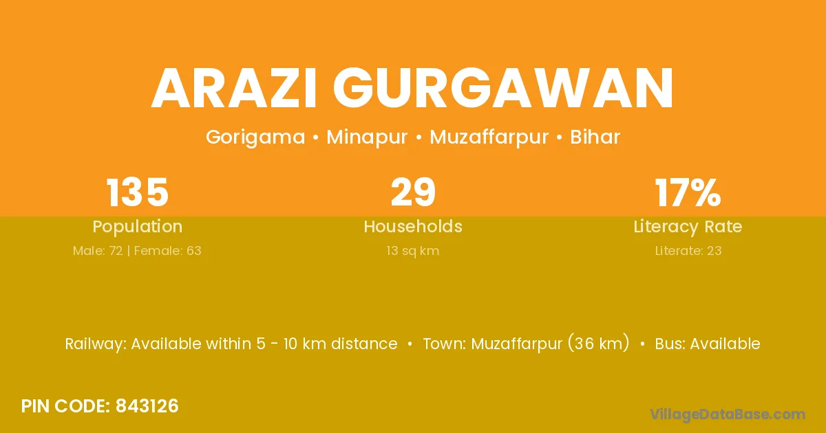 Muzaffarpur (36 km) is the nearest town to Arazi Gurgawan village for major economic activities and is located approximately 36 km away.