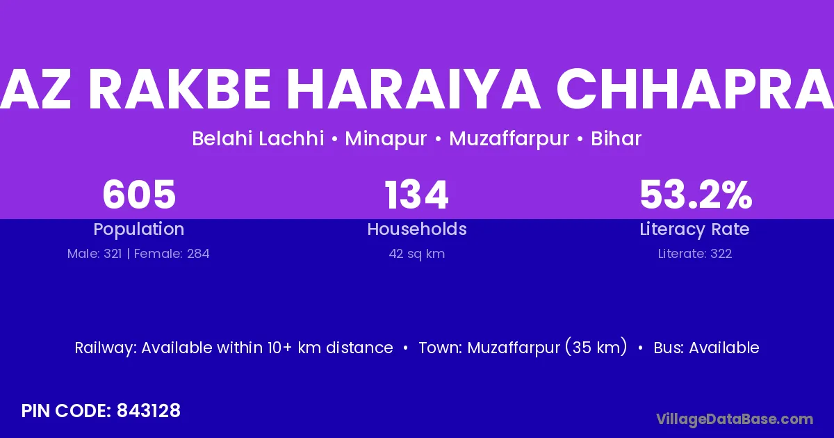 Az Rakbe Haraiya Chhapra village has a total population of 605 people, of which 321 are males and 284 are females.