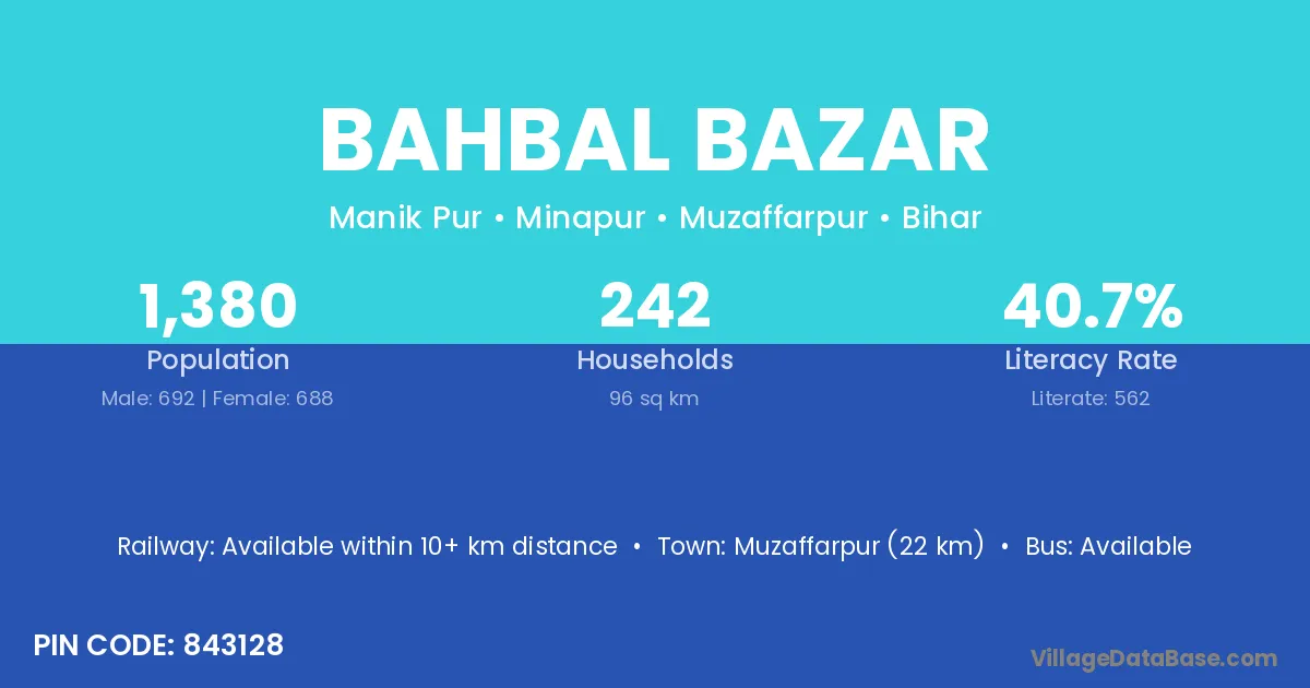 Muzaffarpur (22 km) is the nearest town to Bahbal Bazar village for major economic activities and is located approximately 22 km away.