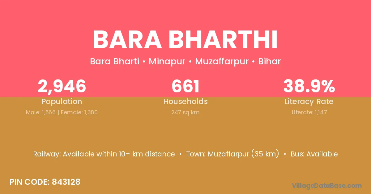 Muzaffarpur (35 km) is the nearest town to Bara Bharthi village for major economic activities and is located approximately 35 km away.