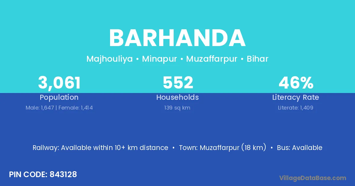 Muzaffarpur (18 km) is the nearest town to Barhanda village for major economic activities and is located approximately 18 km away.