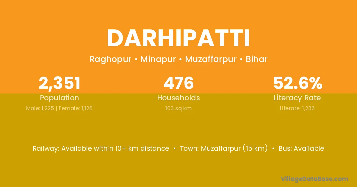 Muzaffarpur (15 km) is the nearest town to Darhipatti village for major economic activities and is located approximately 15 km away.