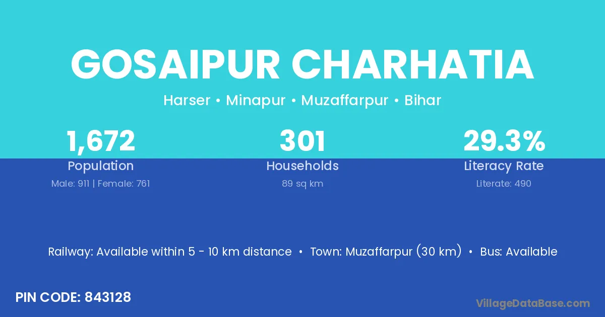 Muzaffarpur (30 km) is the nearest town to Gosaipur Charhatia village for major economic activities and is located approximately 30 km away.