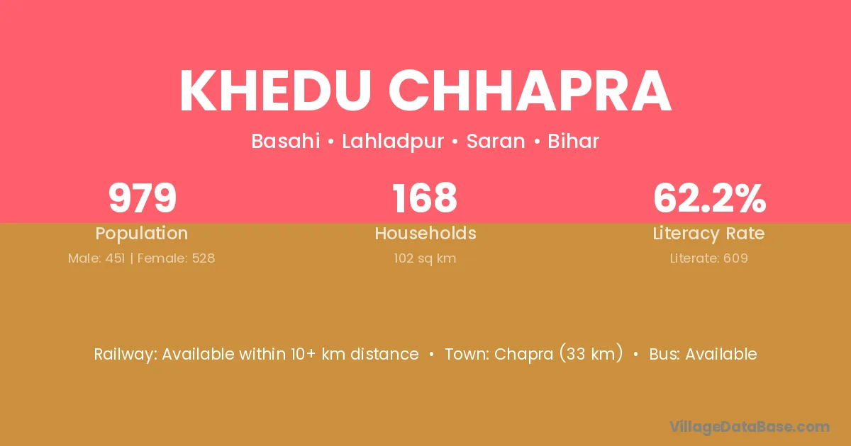 The literacy rate of Khedu Chhapra village is 15.94%. Male literacy stands at 20.32% and female literacy at 10.63%.