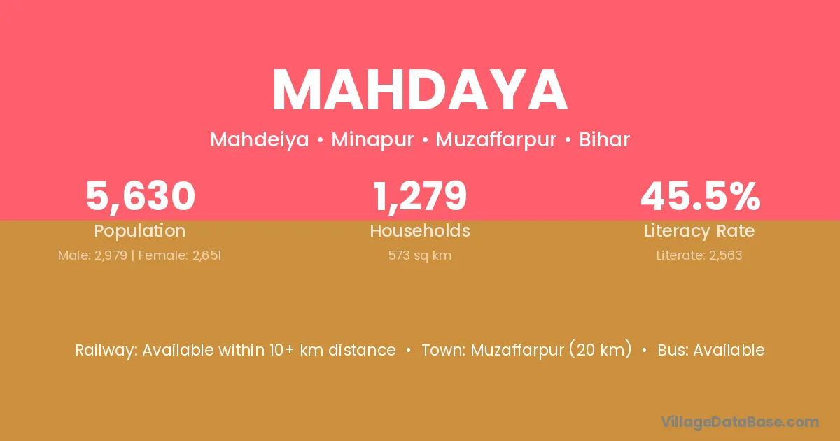 Muzaffarpur (20 km) is the nearest town to Mahdaya village for major economic activities and is located approximately 20 km away.