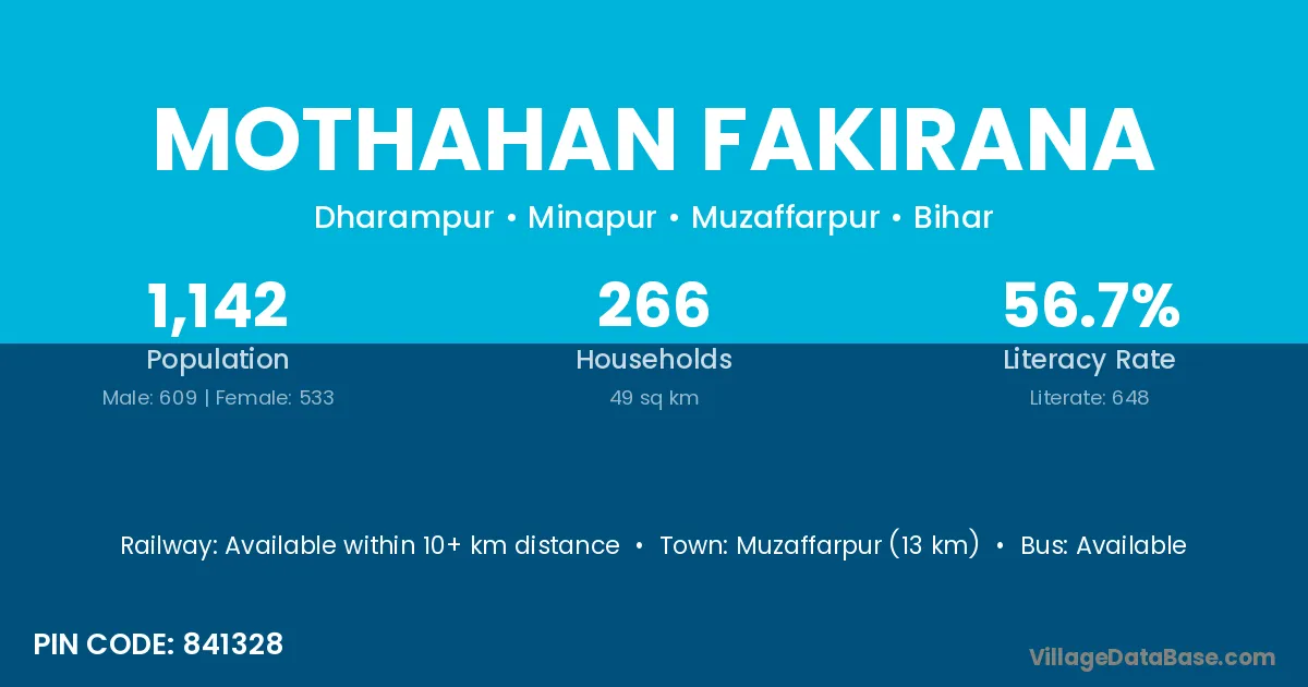 Muzaffarpur (13 km) is the nearest town to Mothahan Fakirana village for major economic activities and is located approximately 13 km away.
