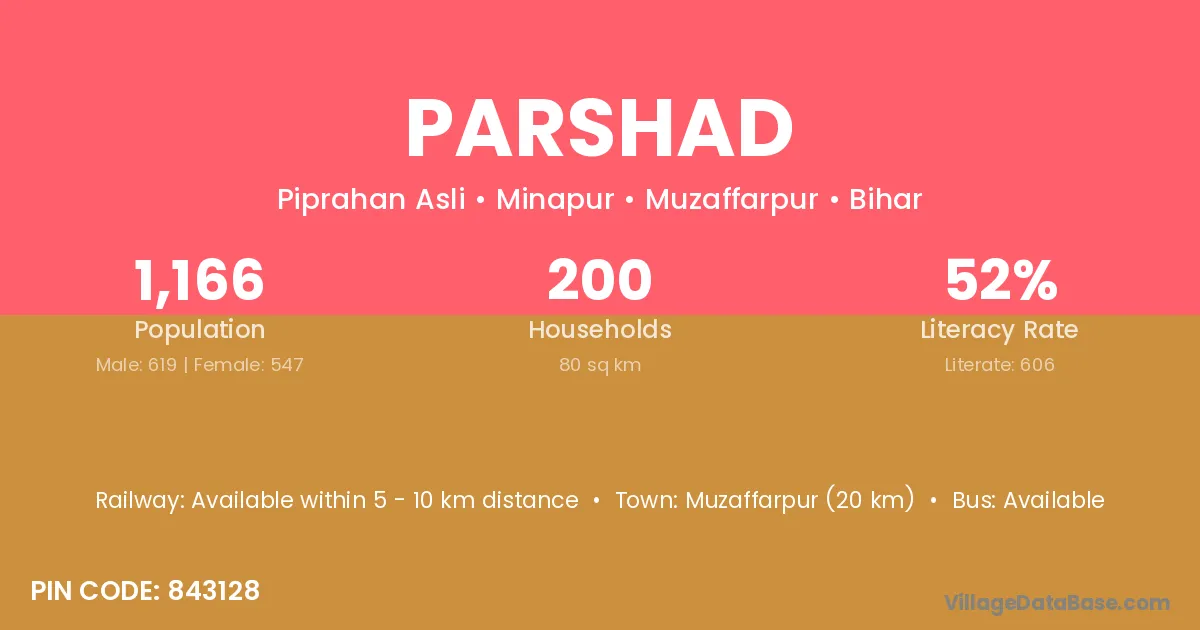 Muzaffarpur (20 km) is the nearest town to Parshad village for major economic activities and is located approximately 20 km away.