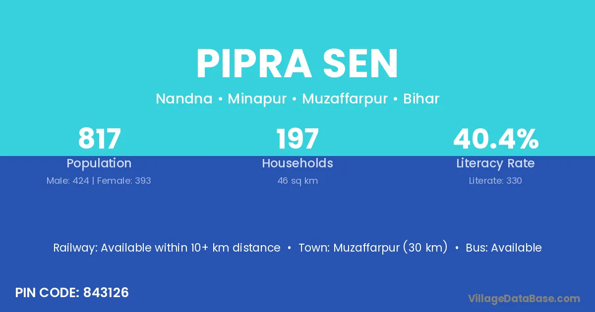 Muzaffarpur (30 km) is the nearest town to Pipra Sen village for major economic activities and is located approximately 30 km away.