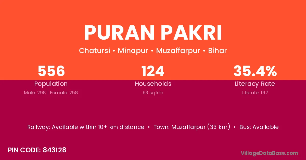 Muzaffarpur (33 km) is the nearest town to Puran Pakri village for major economic activities and is located approximately 33 km away.
