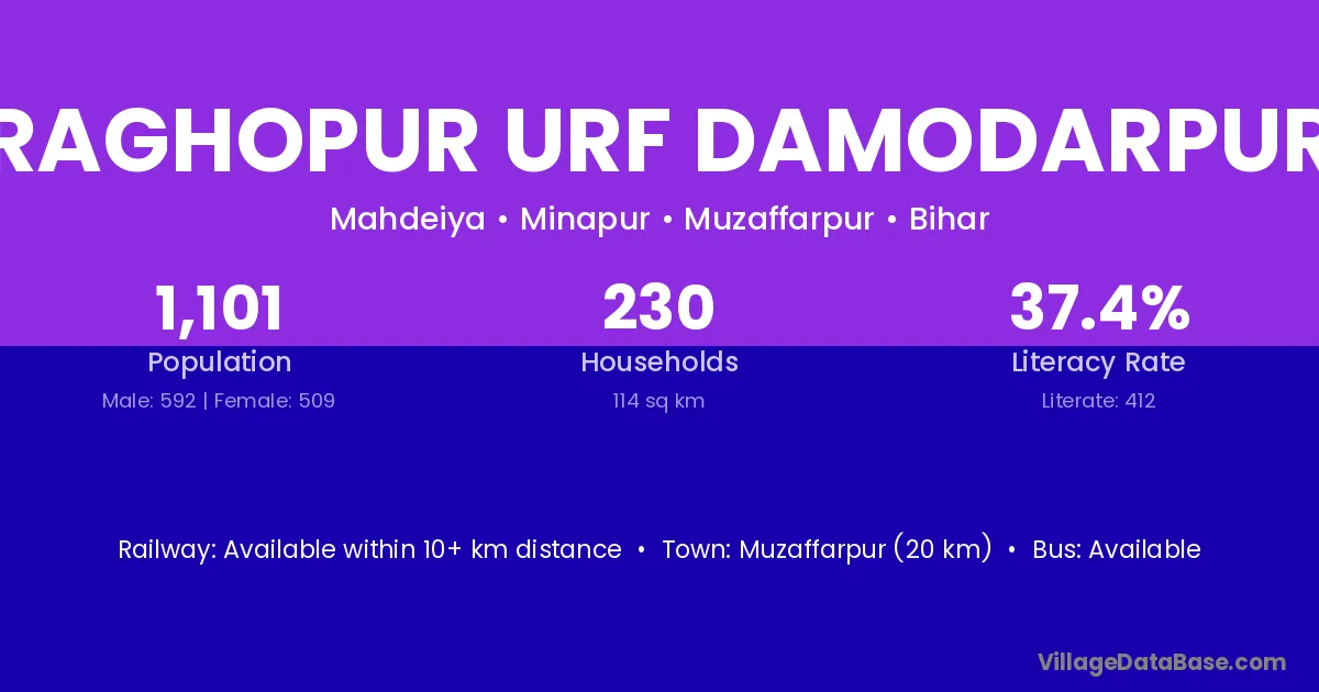 Muzaffarpur (20 km) is the nearest town to Raghopur Urf Damodarpur village for major economic activities and is located approximately 20 km away.