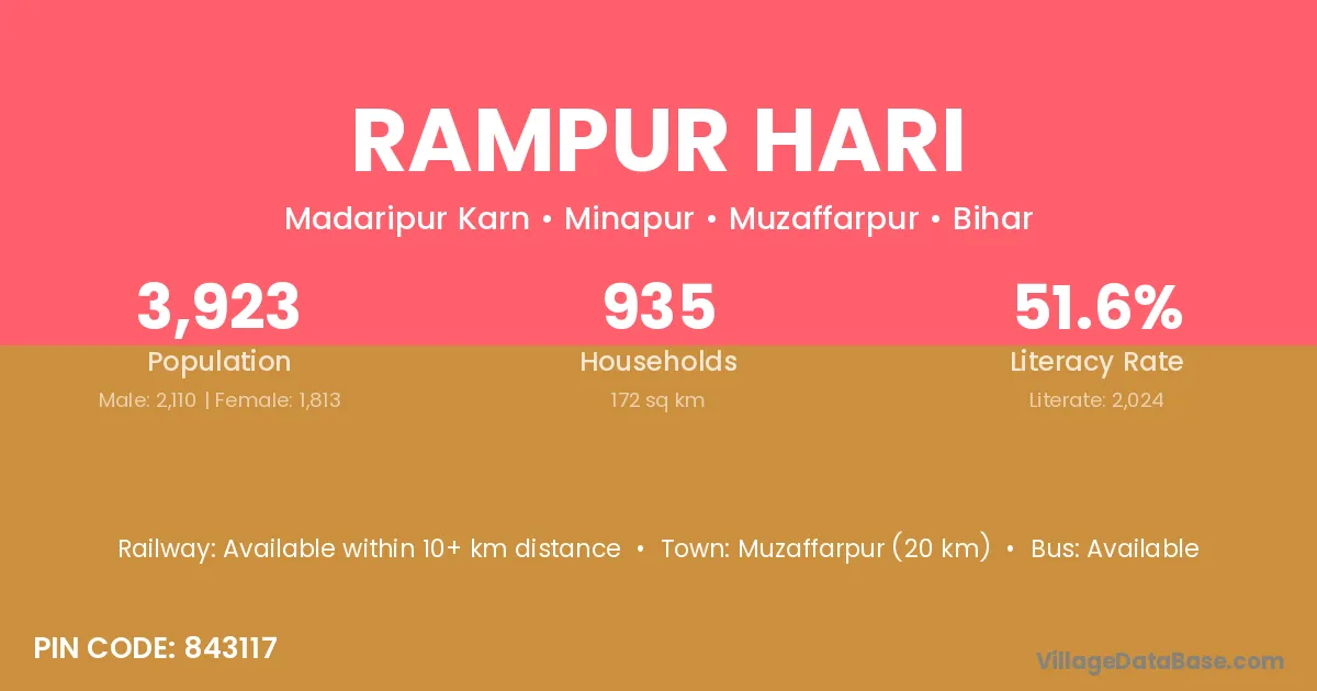 Muzaffarpur (20 km) is the nearest town to Rampur Hari village for major economic activities and is located approximately 20 km away.