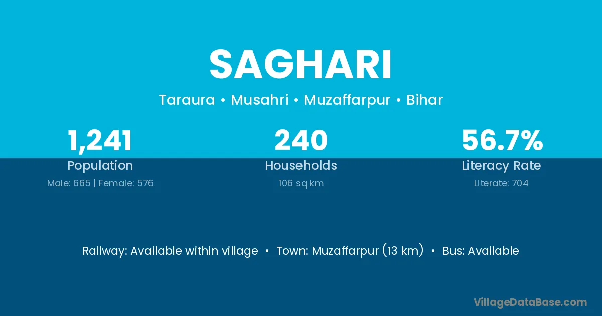 Muzaffarpur (38 km) is the nearest town to Saghari village for major economic activities and is located approximately 38 km away.