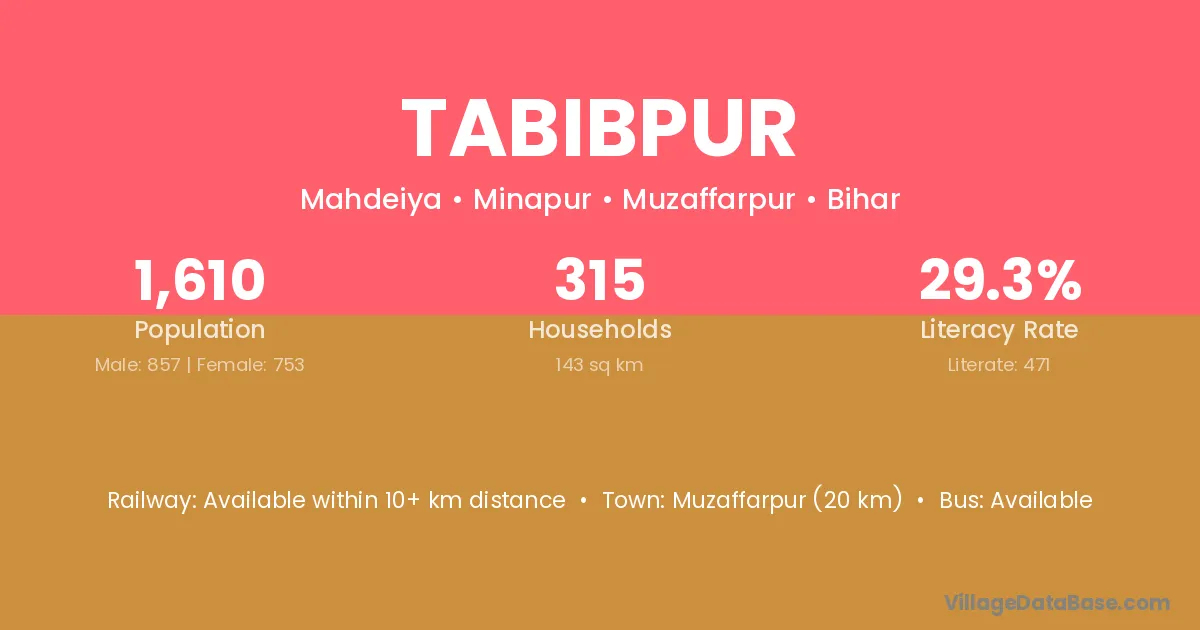 Muzaffarpur (20 km) is the nearest town to Tabibpur village for major economic activities and is located approximately 20 km away.