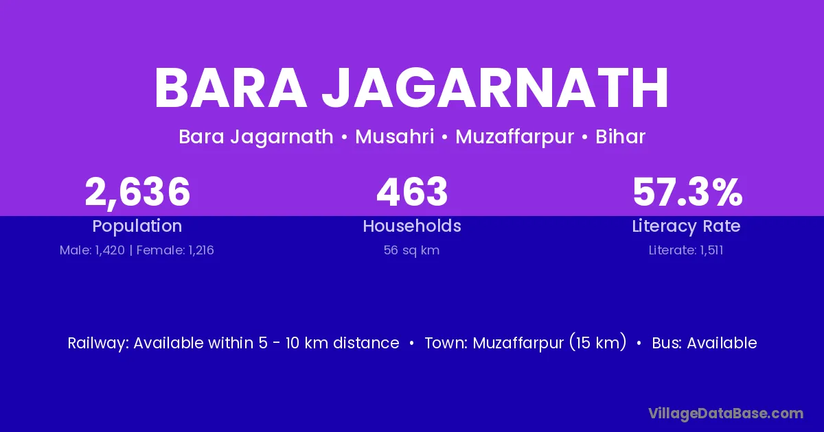 Muzaffarpur (15 km) is the nearest town to Bara Jagarnath village for major economic activities and is located approximately 15 km away.