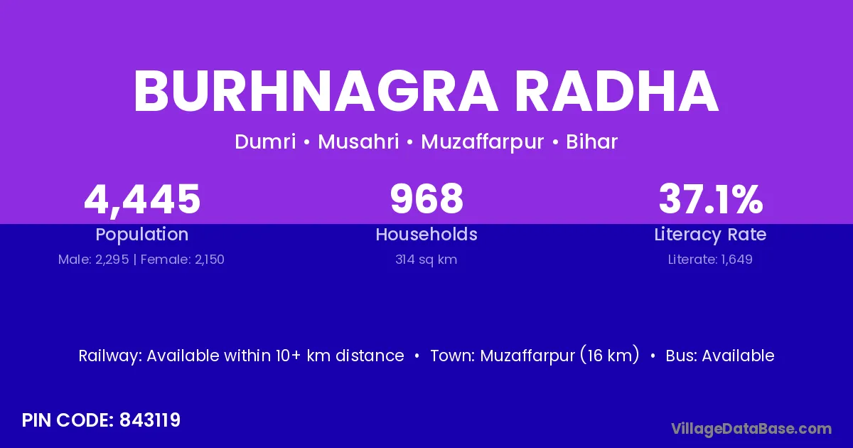 Muzaffarpur (16 km) is the nearest town to Burhnagra Radha village for major economic activities and is located approximately 16 km away.