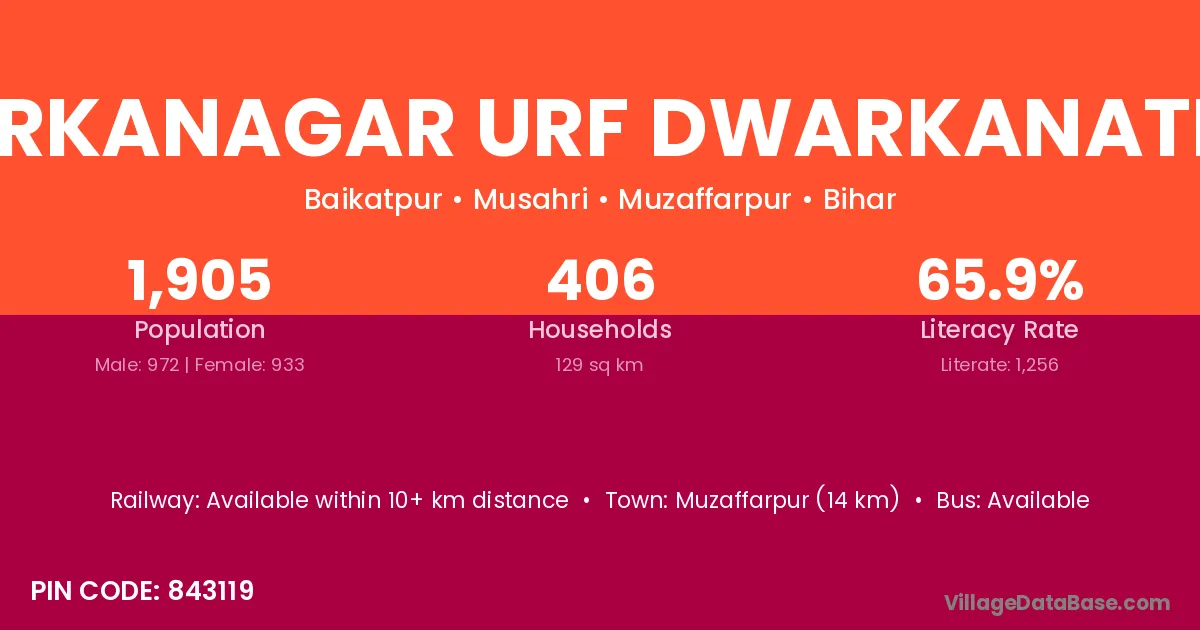 Dwarkanagar Urf Dwarkanathpur village has a total population of 1,905 people, of which 972 are males and 933 are females.