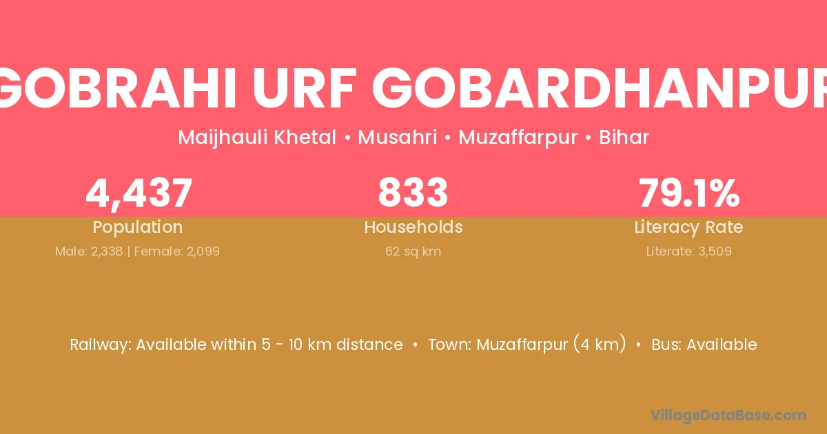 Muzaffarpur (4 km) is the nearest town to Gobrahi Urf Gobardhanpur village for major economic activities and is located approximately 4 km away.