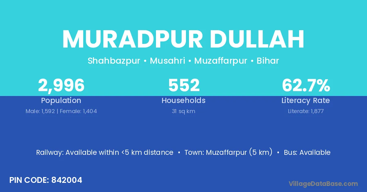 Muzaffarpur (5 km) is the nearest town to Muradpur Dullah village for major economic activities and is located approximately 5 km away.