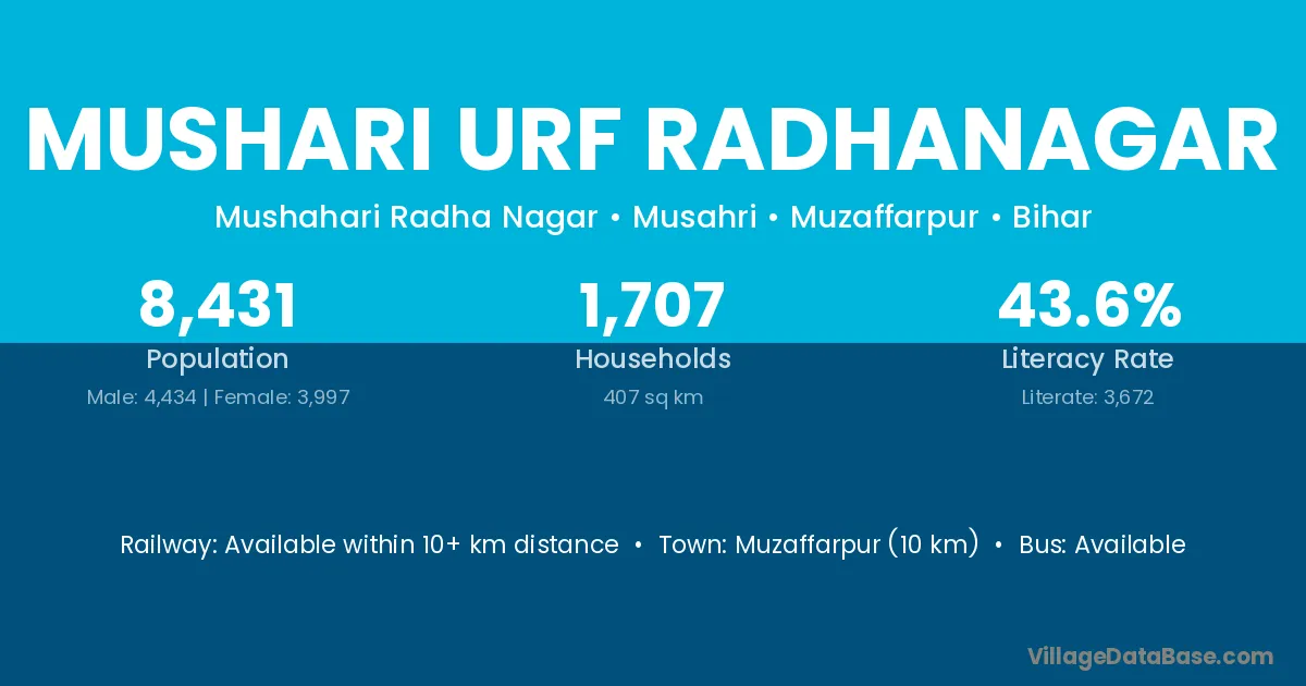 Mushari Urf Radhanagar village has a total population of 8,431 people, of which 4,434 are males and 3,997 are females.