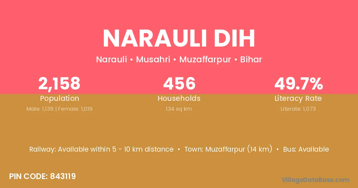 Muzaffarpur (14 km) is the nearest town to Narauli Dih village for major economic activities and is located approximately 14 km away.
