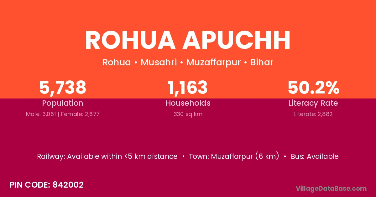 Muzaffarpur (6 km) is the nearest town to Rohua Apuchh village for major economic activities and is located approximately 6 km away.