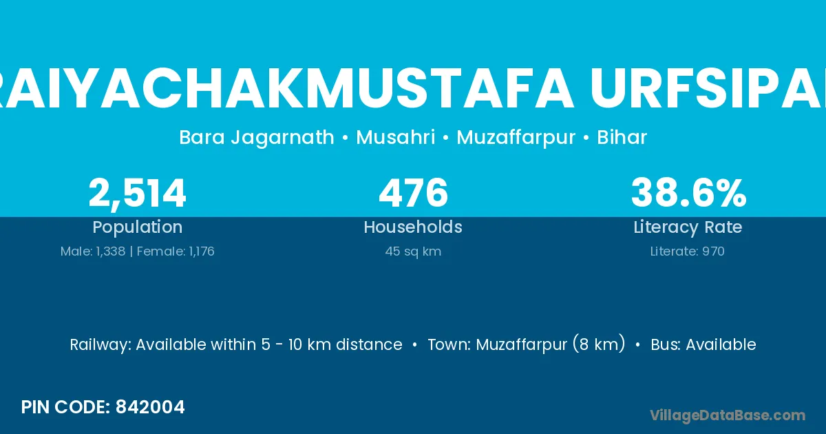 Muzaffarpur (8 km) is the nearest town to Saraiyachakmustafa Urfsipapur village for major economic activities and is located approximately 8 km away.