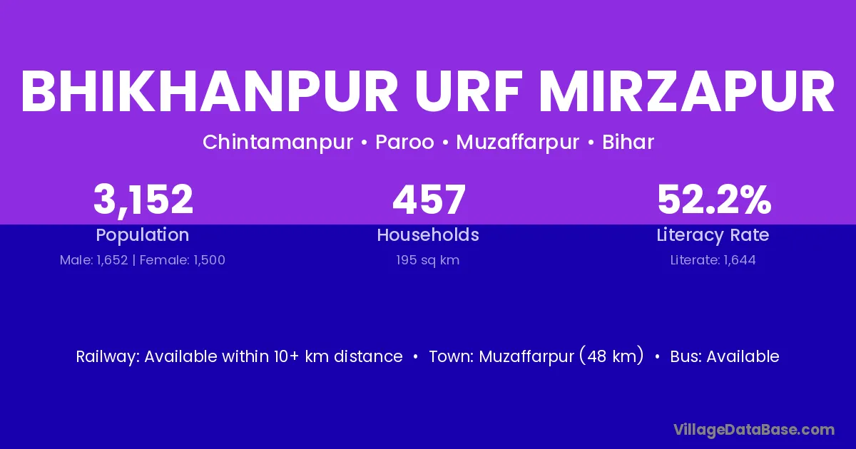 Muzaffarpur (48 km) is the nearest town to Bhikhanpur Urf Mirzapur village for major economic activities and is located approximately 48 km away.