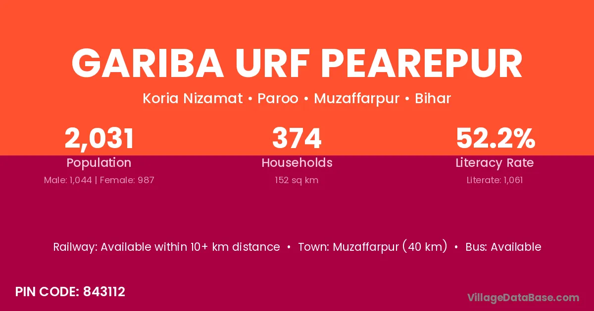 Muzaffarpur (40 km) is the nearest town to Gariba Urf Pearepur village for major economic activities and is located approximately 40 km away.