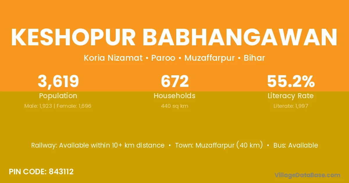 Muzaffarpur (40 km) is the nearest town to Keshopur Babhangawan village for major economic activities and is located approximately 40 km away.