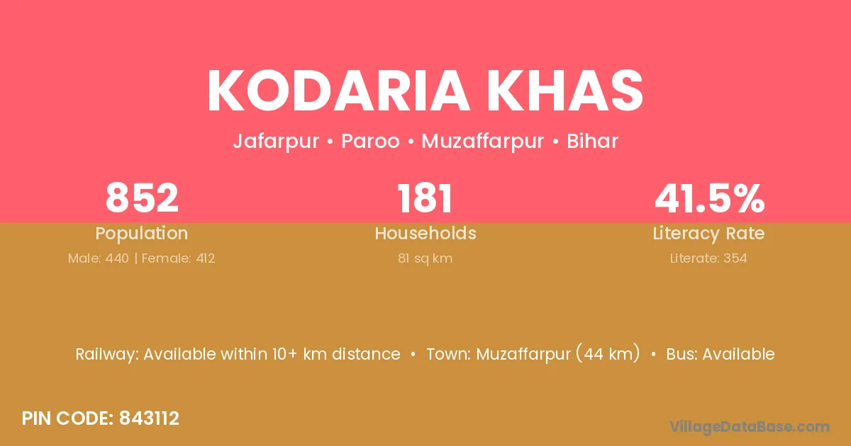 Muzaffarpur (44 km) is the nearest town to Kodaria Khas village for major economic activities and is located approximately 44 km away.