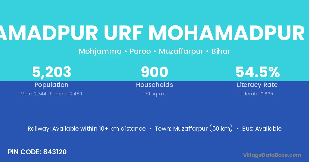 Muzaffarpur (50 km) is the nearest town to Mahamadpur Urf Mohamadpur Park village for major economic activities and is located approximately 50 km away.